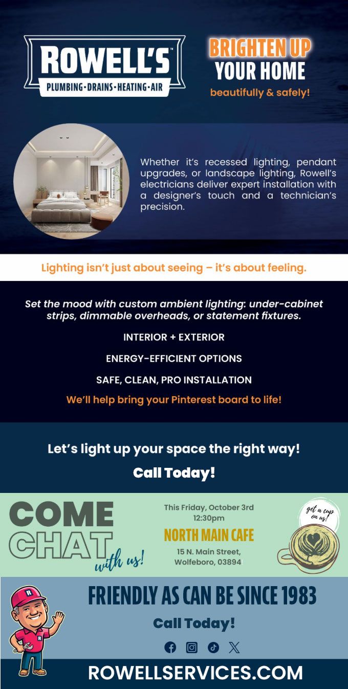 "Friendly As Can Be Since 1983!" When you need help with your plumbing, drains, heating, cooling or electrical in Derry, you can always rely on Rowell's Services! Call us now or book online!